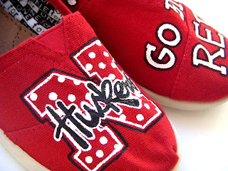 Yesterday I painted some Nebraska Huskers TOMS...and I'm kinda in love with them. These cute little polka dots are sure to have you yelling "Go Big Red" at every game! If you would like to share your love for another team with a pair of custom painted TOMS, please email me or leave a comment below!